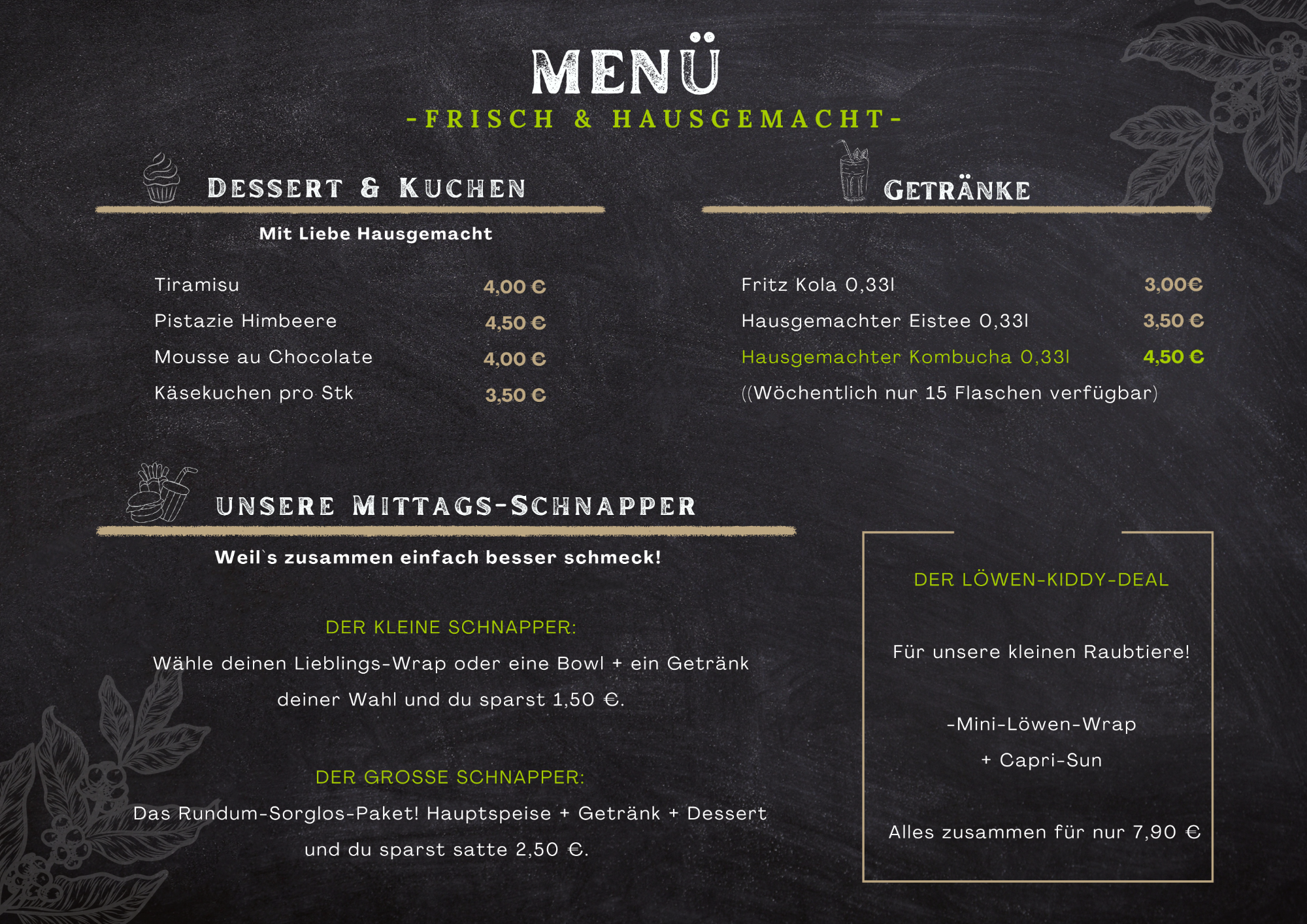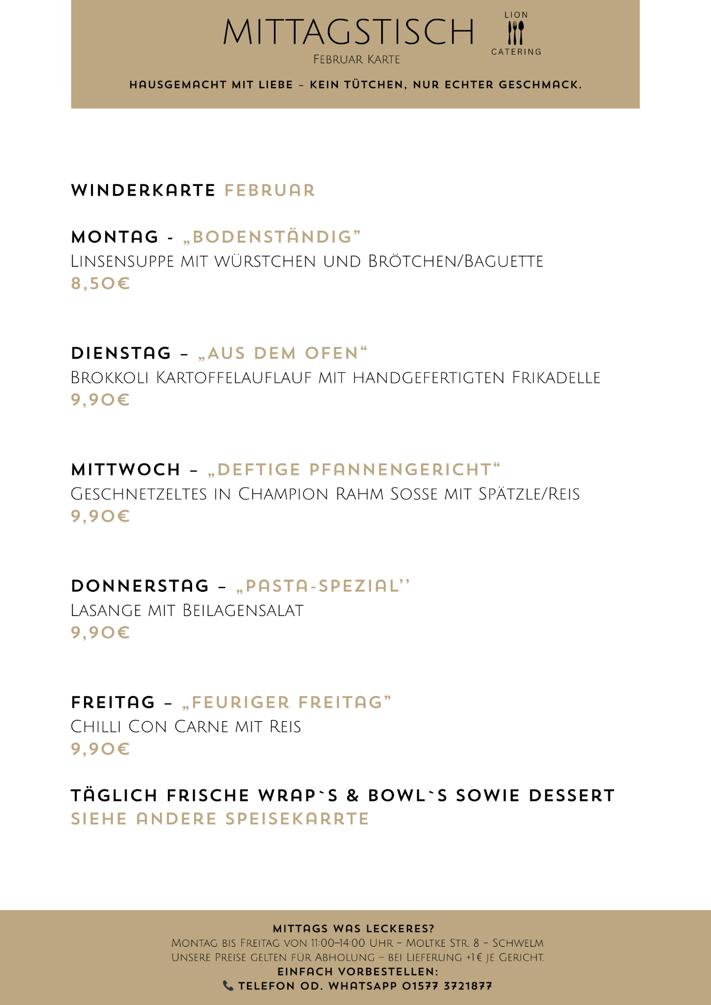Warmer Mittagstisch: immer von 11:00 – 14:00 Uhr ( Weitere Leckereien entnehmen sie bitte der anderen Karten )
