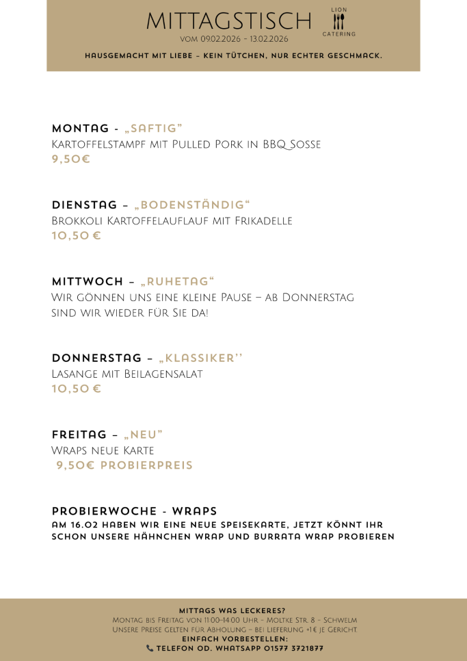Montag – Freitag: 11:00 – 14:00 Uhr ( wir haben ab dem 16.02.26 wieder Mittwoches geöffnet )